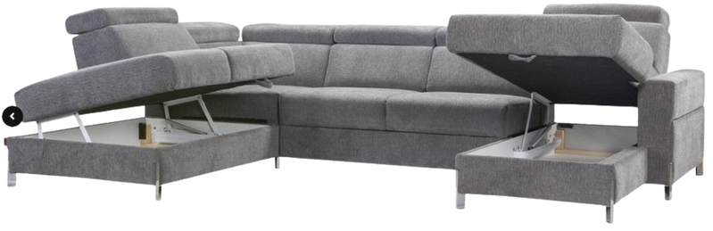 Têtières relevables. Structure en panneaux de particules et bois massif. Garnissage : Mousse polyuréthane respirante haute résilience et ressorts à plat sinusoïdale en acier. Dossier : sangles élastiques. Revêtement : Polyuréthane et ou tissus. Densité assise : 30/35 kg /m3. Dimensions : Selon configuration. P : 98 cm. H : 85 / 110 cm. Hauteur assise : 44 cm. Zone de couchage : 265 x 124 cm. Pieds : métal et plastique. Garantie : 2 ans